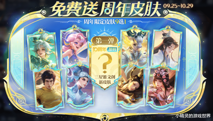 周年限定 9 选 1 皮肤:9 月 25 日起至 10 月 29 日,玩家参与周年庆专属活动,可从 2-9 周年限定皮肤及十周年三星堆主题史诗皮肤中共选 1 款免费兑换。涵盖甄姬《游园惊梦》、杨玉环《遇见飞天》等经典史诗,以及全新三星堆文创皮肤,堪称 “史诗皮肤自由” 福利。